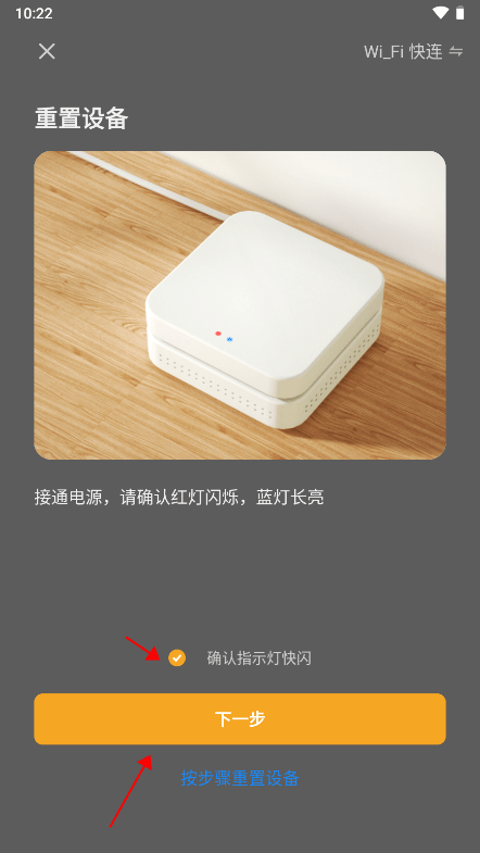 7、这时候要确保设备已经是接通了电源,设备处于正常状态,勾线确认指示灯快闪并点击下一步。