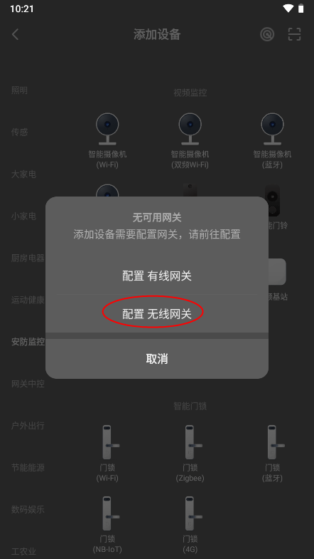 5、在添加设备前要通过网络的形式将手机和设备连接在一起,这儿有两种连接形式,选择配置无线网关。