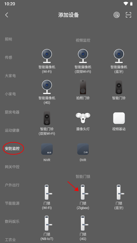 4、门锁是在安防这一类的,所以选择安防监控,根据自家门锁的型号来选择添加的门锁设备。