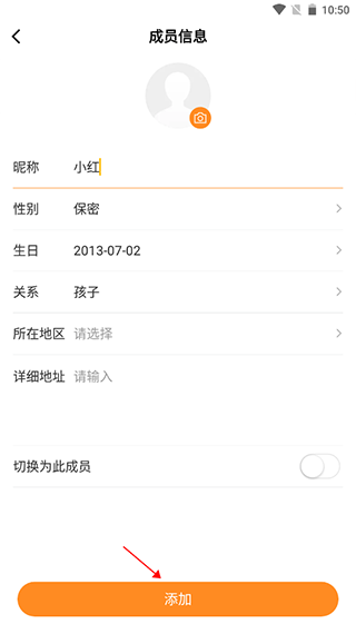 4、输入新的成员的基本信息,点击“添加”,将这个成员添加进来。