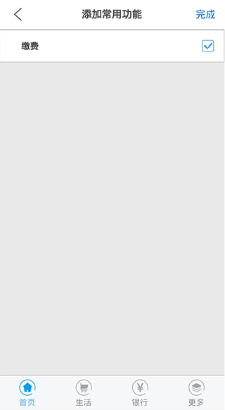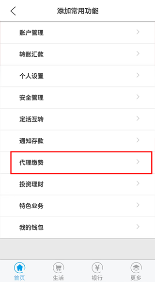 2、跳转至:【添加常用功能】,在页面内选择需要经常使用的功能,如:【代理业务】-【缴费】