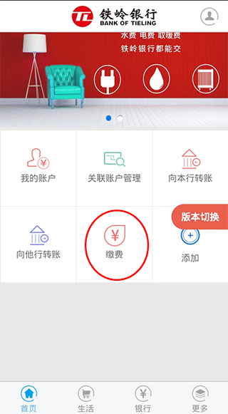 1、登录铁岭银行手机银行app,在首页内点击:【添加】