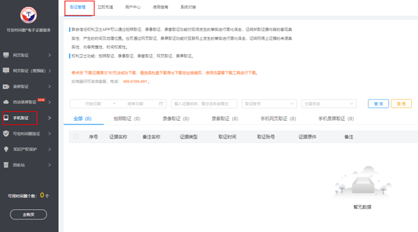 二、请使用权利卫士账号登录电脑端电子证据平台,到“取证管理-手机取证”页面下载已上传的证据原件,以及tsa文件和pdf证书