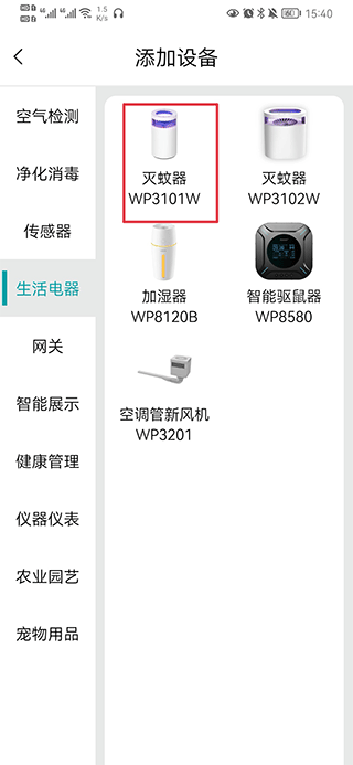 二、选择要添加的设备与型号,如灭蚊器 WP3101W