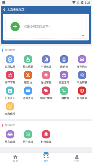 2、然后点开服务,这里可以添加你的爱车,试乘试驾、预约保养、一键救援等服务;