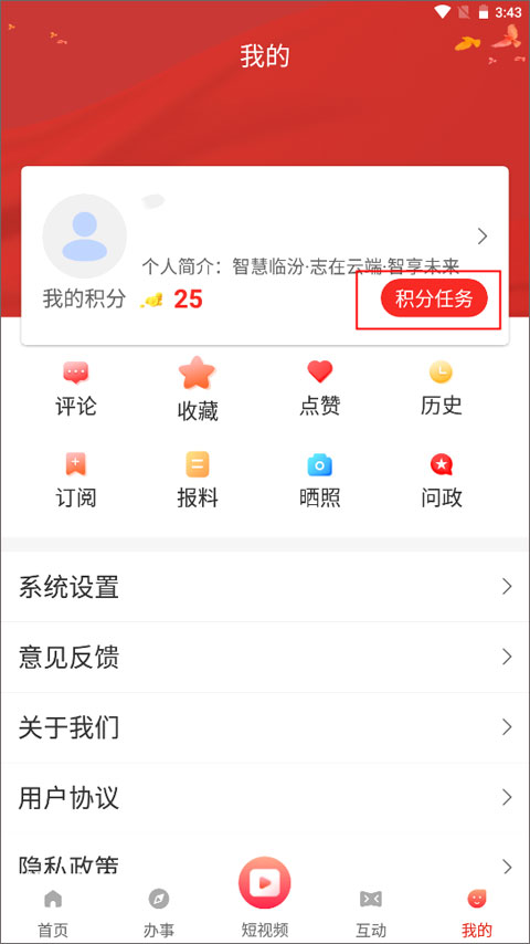 1、选择下方菜单栏【我的】界面,在上方你会看到自己的积分数量,点击右边的“积分任务”。
