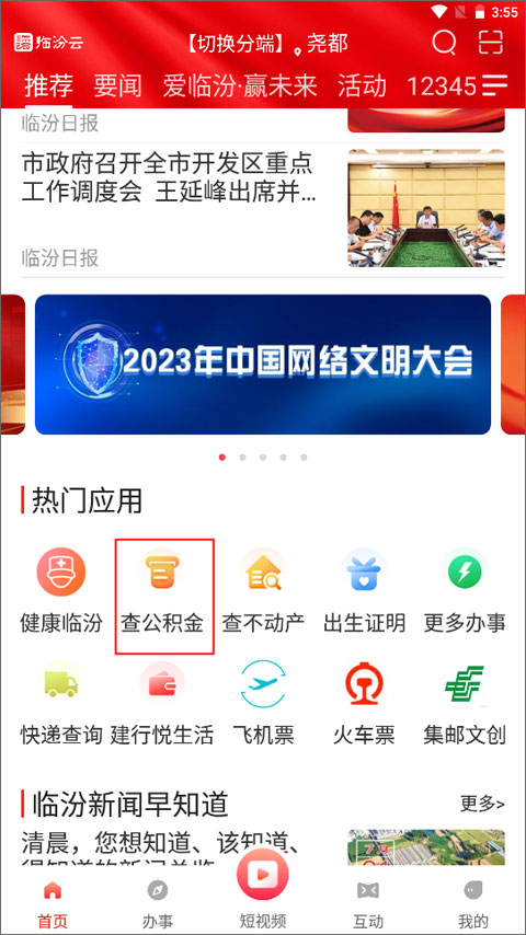 1、同样还是在【首页】,在热门应用中找到查公积金,或者切换到【办事】中点击查公积金。