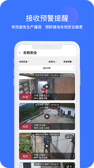 ● 接收预警提醒,查看危险事件的监控视频,预防猪场未知安全隐患;