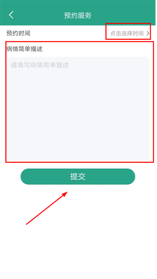 3、进入【预约服务】页面,填写【预约时间】及病情简单描述后,点击提交。