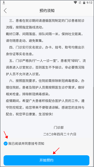 2、先了解一下预约须知,了解完之后勾选已阅读,然后点击“开始预约”。