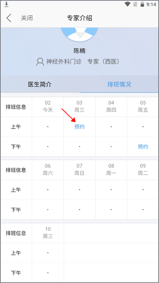 6、点进去一个医生的个人界面,会看到那个医生的排班情况,选择有预约的时间。