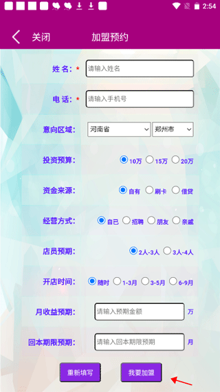3、填写自己的基本信息和店铺的信息,最后点击“我要加盟”,等后台发短信通知你。