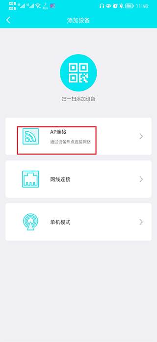 二、可以通过扫描设备上的二维码进行绑定,若扫描不了可以使用下方其他方式连接,如ap连接