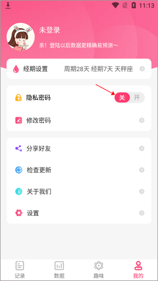 1、进入软件后,切换到“我的”菜单栏,点击隐私密码的“开关”按钮。