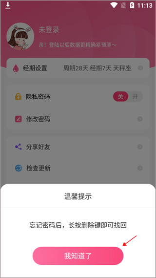 2、这时候会弹出一个提示,就是如果忘记密码,可以长按删除键找回密码,点击“我知道了”。