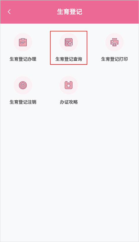 1、在首页点击【生育登记查询】跳转至子女生育登记证查询页面,选择“生育登记查询”