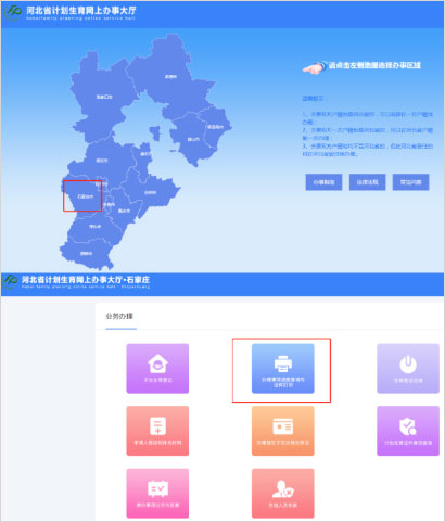 选择所在地市,如选择石家庄后,进入石家庄市计划生育网上办事大厅,选择"办理事项进度查询与证件打印",输入女方身份证号、男方身份证号和验证码查询后点击右侧打印按钮进行打印,也可以到xx市任一计划生育便民服务大厅领取。