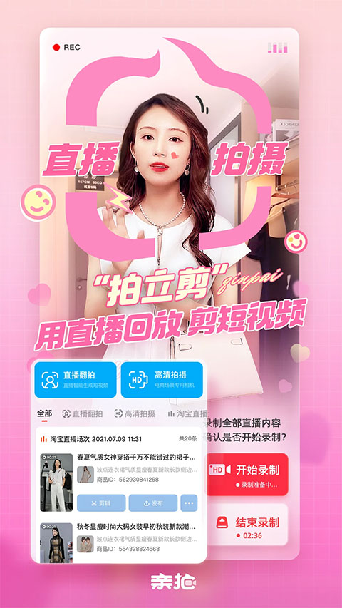 另外,亲拍app拥有直播翻拍和电商相机功能,直播翻拍可以一键录制你的全程直播,在云端自动生成商品回放片段,并且支持即拿即用,在电商相机功能中搭载了不同行业的场景滤镜,提升画面整体质感,让画面显得更加精致。总体来说,这是一款不可多得的剪辑软件,需要这款软件的用户可以来本站下载安装。