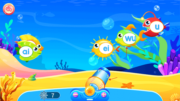6、例如快乐捕鱼游戏,在这里只要用捕鱼网抓到带有正确拼音的小鱼就可以获胜了,十分有趣。
