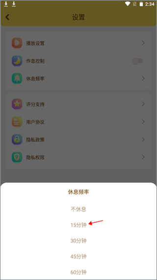 3、选择自己要休息的时间频率,选好后就点击它,等播放儿歌结束后,就开始休息了。