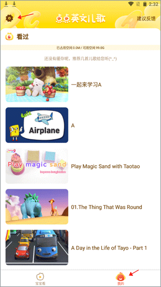 1、打开软件后会看到很多的英文儿歌,切换到“我的”界面,点击左上角的齿轮图标。