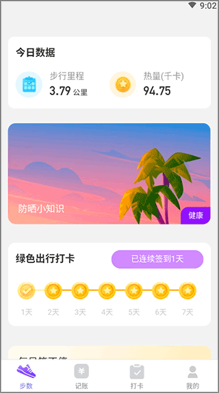 天天运动app是一款健康生活的手机软件,可以精确的记录小伙伴们每日运动数据,大家可以在软件内了解自己的运动步数,软件还把大家每天运动消耗的卡路里记录下来,是大家运动健身的好帮手。此外,用户们也可以在软件创建每日打卡目标,把每天想做的事情都写在天天运动app里,然后每天都坚持打卡,慢慢的就会养成自律的好习惯,同时还有账单记录功能,用户可以清楚的记录每一笔收入和支出,要想健康的生活就快来下载体验吧。
