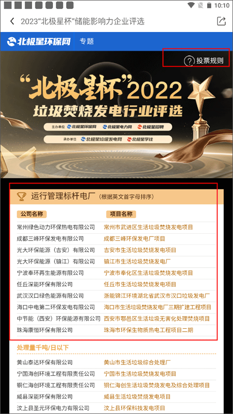 2、跳转到最新一年当中的“北极星杯”储能影响力企业评选,往下翻就可以查看到很多的公司名单。你可以点击右上方的“投票规则”了解这项活动的评选资格。
