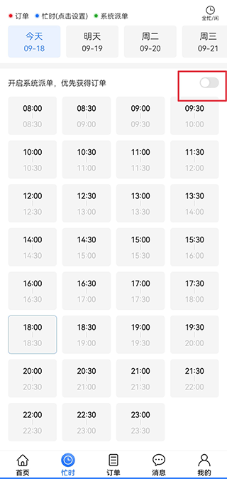5、在忙时界面中,将系统派单开启,可以优先获得订单