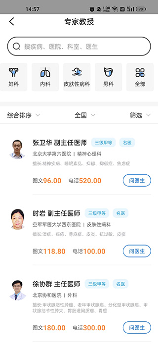 有500家三甲医院,10万+主任医师、副主任医师、主治医师,医疗自选非常丰富,而且科室齐全,医生7*24h全程在线候诊,如遇问诊咨询,可以得到快速回复。