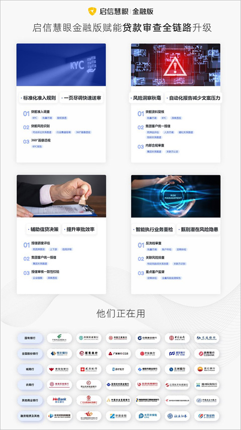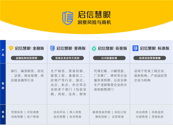 截至目前,3大垂直版本已新签客户超500家,另外近百家企业版老客户从标准版升级为垂直版。至此,启信宝企业版正式更名为“启信慧眼”SaaS云平台:基于启信宝商业大数据平台,结合人工智能技术,融合多种细分业务场景,打造的标准化SaaS云平台,以SaaS产品模式为企业提供轻量化、易上手的风控与营销协同系统。本次更名,代表着启信宝企业版的一个新的发展里程碑,具有重大意义,标志着启信宝企业端业务正式从泛场景服务迈向行业深度应用。