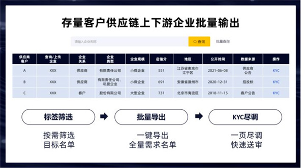 银行客户经理可通过单个查询或批量上传方式,批量获取存量客户上下游企业,并进一步筛选展开营销。