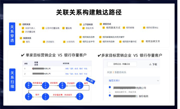 关联关系触达提升营销成功率通过以上方式挖掘到的存客名单,以及支行接收到上级银行推送下发的名单,都可以通过本行存量客户与名单企业关联关系排查与关系图谱分析,快速梳理潜在客户与存量客户关联路径,更便捷、高效地实现营销触达。