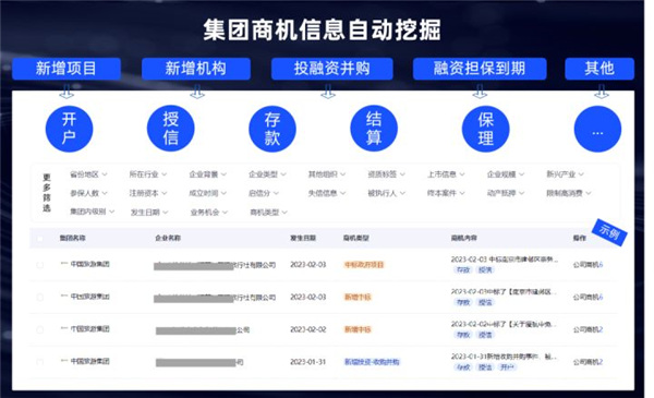 2、集团公司新增商机捕捉在具体集团公司主页中,也可查阅该集团的各类商机信息,如新增中标、开设子公司、新增发债等,银行可及时推进增信、存贷款业务。在集团主页可以将改集团添加“关注”,在关注页面会直接提示相关集团新增商机线索;对于商机列表也支持导出,客户经理可以根据商机内容及时联系客户,推进新业务。