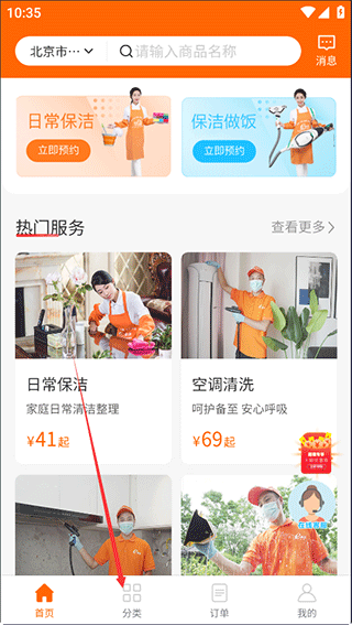 1、如需预约家政服务,仅需打开e家政客户端在首页下方菜单栏中选择“分类”进入;