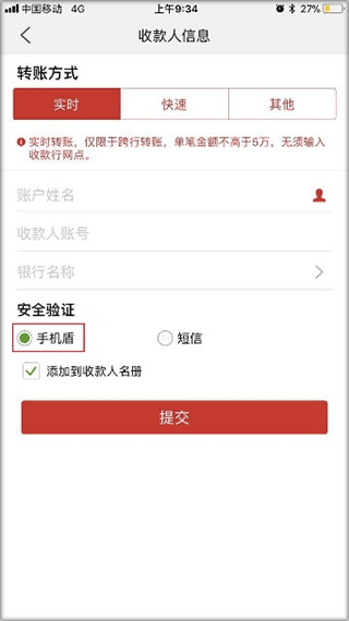 1、 进入广东南粤银行手机银行app转账汇款的页面,选择手机盾做为本次转账的认证方式;