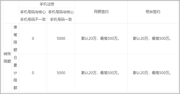 通过手机银行自助注册且注册手机号码为我行预留的手机号码客户日累计转账限额默认为¥2,000.00,最高限额¥5,000.00。通过个人网银自助签约和营业柜台签约的客户日累计转账限额默认为¥200,000.00,最高限额¥5,000,000.00。客户可登陆手机银行,选择“全部功能“-->"修改转账限额"修改转账限额。