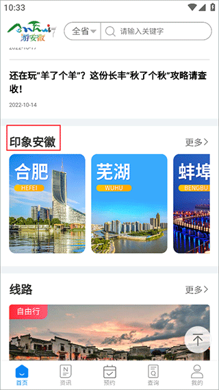 2、首页向下划,找到印象安徽,选择你想了解的城市点击进去,以合肥为例