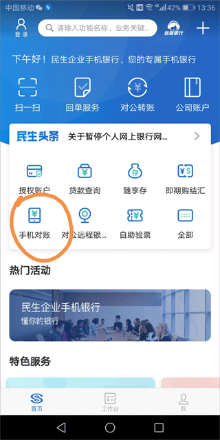 网点排号、民生资讯、金融助手、回单验证、民生客服。
