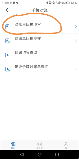 3、如果是双人对账模式,则手机银行操作员二也登录app进入首页点击“手机对账”,然后再点击“对账单回执复核”