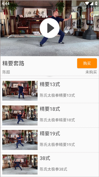 陈氏太极拳教学手机版是一款学习太极拳的app应用,主打陈式太极拳,陈式太极拳其前身为陈家沟拳术,属于太极拳流派之一,用户只需购买一次课程即可永久享受,以视频的形式学习武术,专业武师耐心指导演练,其上乘的投技以及独特的演练风格在业内享誉盛名,平台现已签约陈氏太极拳直系传人,其强势入驻意味着开发者对于弘扬中华民族优良传统的决心异常坚定,人们可以更为直观的了解大师,轻松学习太极拳,感兴趣的小伙伴快快点击下载吧。