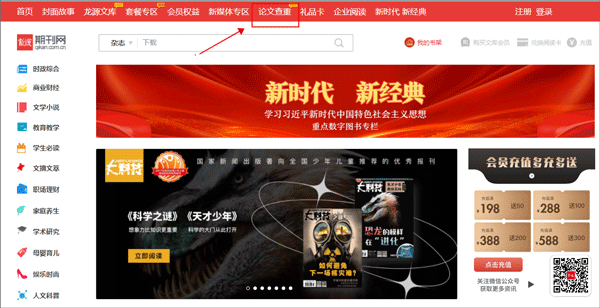 1、在电脑端打开龙源网官方网站,在上方栏目中点击论文查重