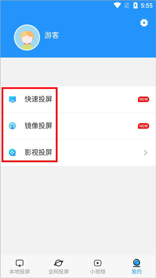 4、我的页面有快速投屏、镜像投屏和影视投屏功能。