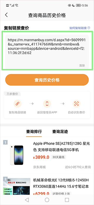 3、复制到绿色方框内,然后点击“查询历史价格”即可查看商品历史价格;