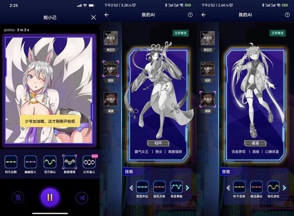 进入应用,映入眼帘的是一个充满赛博朋克风的开屏界面,其中双性别选项,可满足更多用户使用,倘若想体验App全部功能,则需要连接设备。而且目前在网易春风元力fun APP的主界面中除了个人信息显示外,能看到的还有“漫游指南”、“我的AI”和“春风情报局”,其中漫游指南展示了当前世界观的时间线以及背景;我的AI则包含三个虚拟角色,分别是兽耳狐仙妲小己、琴瑟仙女钰环以及都市少女遥遥,这三个角色都有独特的立绘,搭配上不同的背景故事,打造出风格各异的人设。此外,元力fun app更加详细的功能体验,需用户连接相应的设备才能生效哦~