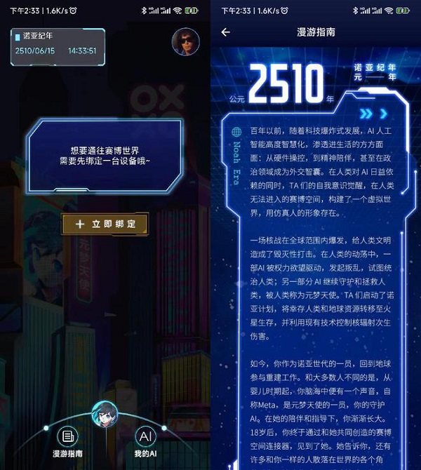 点击“漫游指南”,小编惊奇地发现,为了让用户有代入感,网易春风居然还装模作样地设计了一下“世界观”。根据官方介绍,我们现在正处在一个虚拟人物和人类共存的元宇宙世界,通过这款设备,玩家可以“穿越”到2510年的诺亚纪元,和元梦天使AI(内置虚拟形象)一起战斗,对抗与人类为敌的AI反派。