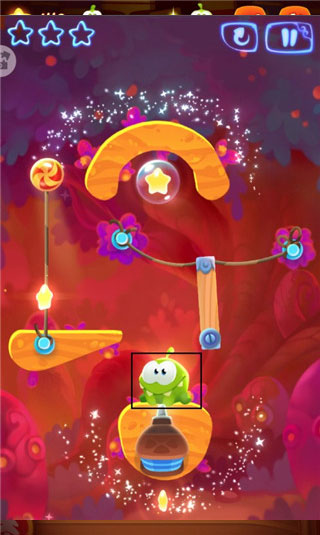 技巧:这一关通过额外任务的只有一个方法,不过运气成分有点高,主要是切割糖果上面和右边绳子的相隔时间,掌握一个时间间隔就能快速掉到下面的石壁(而不被Toss抓到),进行一个反弹,然后收集两颗星星并过关。