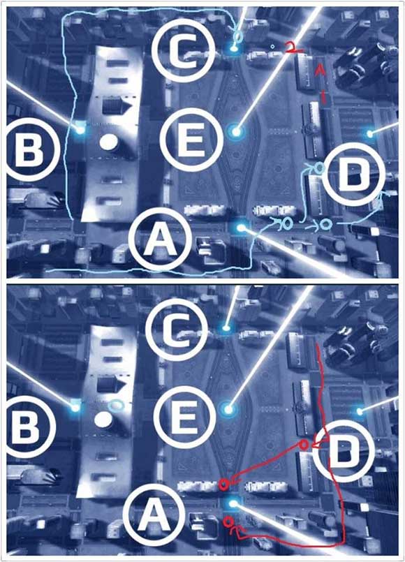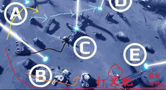 4.当发现蓝军有第一张图的进攻迹象时,立即转移到红2,叉肥继续待红1是等死,等下ee黄炸通通都会飞过来,转移到2后,龟在图一那些进攻路线的敌人就是被你三叉爽打,他却打不到你,这个防守走位一定要非常注意