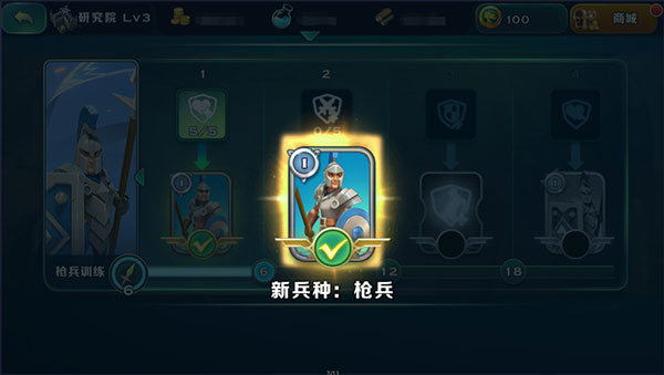 自动解锁了这一列的高级科技“新兵种:枪兵”,研究完成的科技数量变为6个;