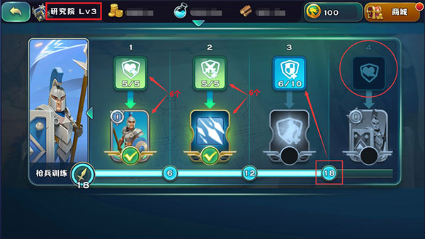 我的研究进度虽然到达了18,但研究所等级只有三级(左上角可见研究院等级),所以暂时无法解锁第四组科技。