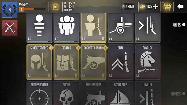 之后指挥官升级以后可以解锁各种职业,比如说一开始的普通步兵,到之后的range,远程火枪兵,support,支援手。每种兵种都有可以用的装甲,装甲有各种技能,比若说一个突击套装可以让你有个盾牌,就是移动掩体。装甲要靠开箱来得到,卡牌和兵种也是一样。
